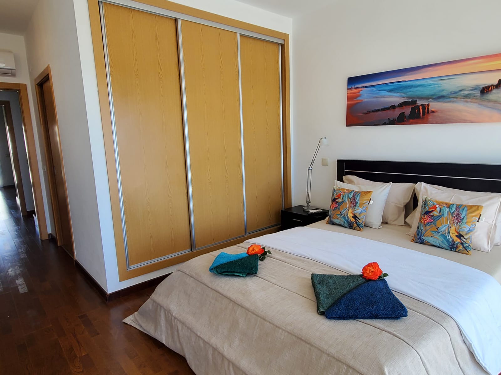 Moradia com 2 quartos, cozinha equipada, 3 casas de banho, sala de estar com sofá e cama de casal, com um terraço no rés do chão com espreguiçadeiras e uma mesa de jantar. Este terraço tem vista para a piscina e exposição solar durante todo o dia. Existe ainda um roof top com vista para a piscina e para o mar com um barbecue e uma mesa de refeições exterior. Quartos com vista para o mar.